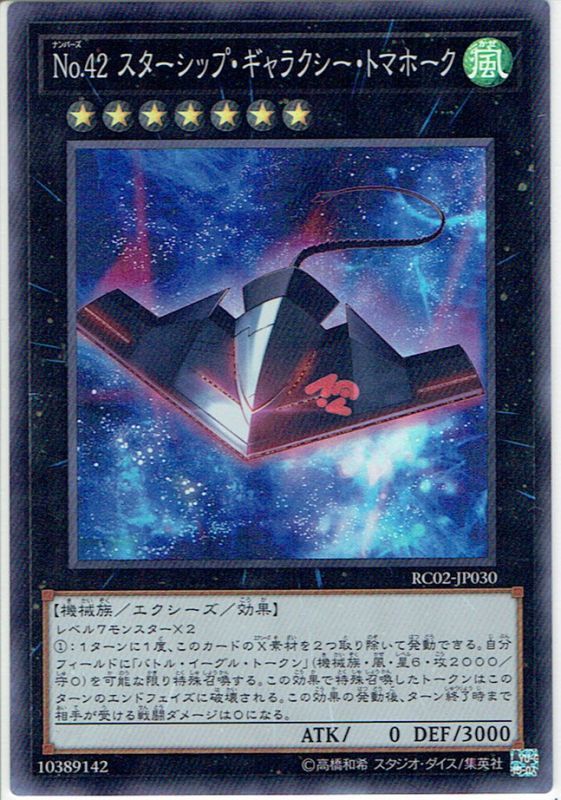 《No42 スターシップ・ギャラクシー・トマホーク》 の効果①で「バトル・イーグル・トークン」を5体特殊召喚できます。 《No42 スターシップ・ギャラクシー・トマホーク》 と「バトル・イーグル・トークン」(1体目)で 《蒼翠の風霊使いウィン》 をNo42 スターシップ・ギャラクシー・トマホークの相場情報(3月22日現在) 1枚約 700円~800円 くらいです。 ここ最近でいきなり値段が上がってきています。vジャンプの付録カードっていうのもありますから、少々危険な香りが・・・No42 스타쉽 갤럭시 토마호크 일어판 명칭 No. (ナンバーズ) 42 スターシップ・ギャラクシー (ナンバーズ) 42 スターシップ・ギャラクシー・トマホーク